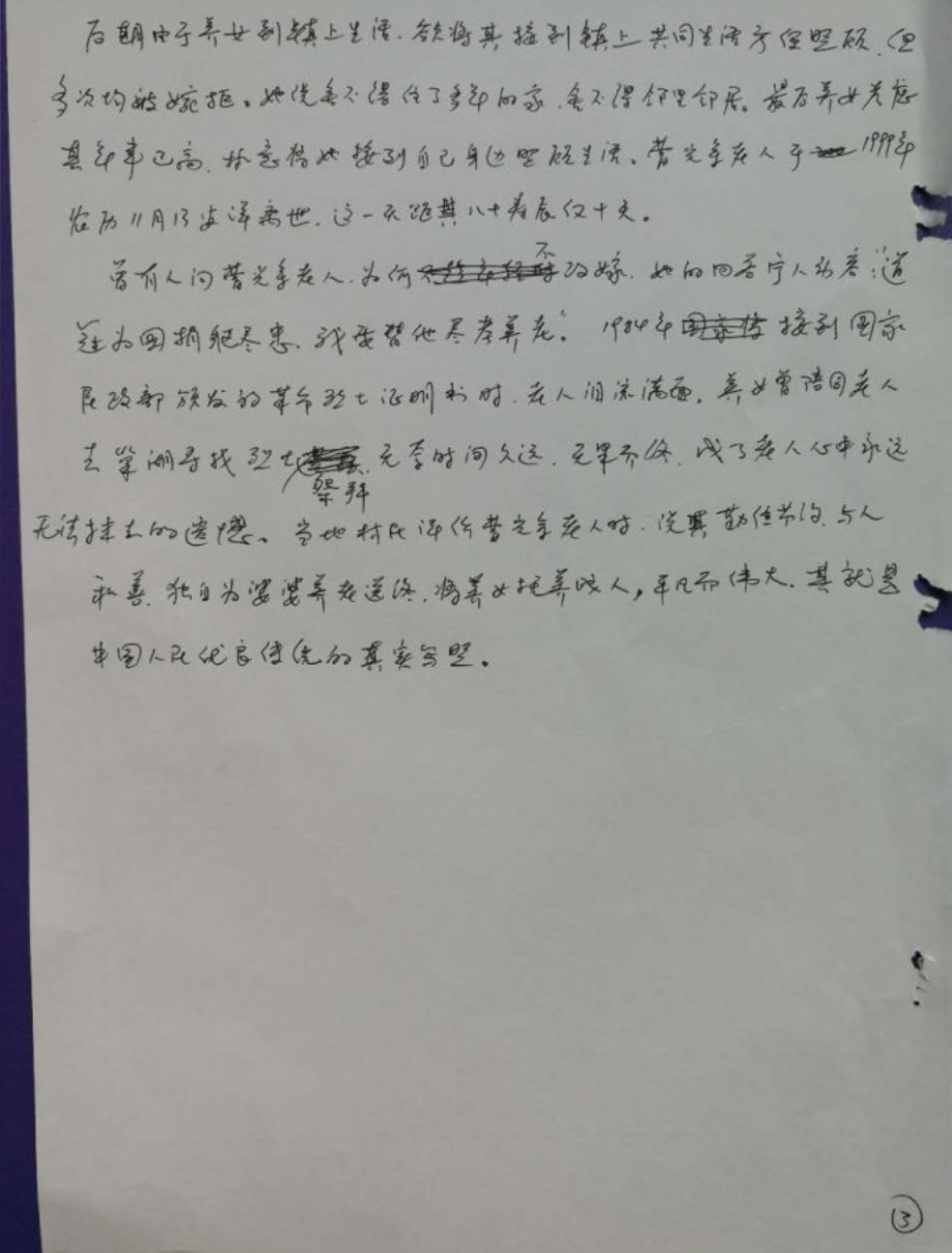 古時(shí)閨閣之中最重忠貞節(jié)孝,近有張氏曹孺人光余者,及笄適張公諱自珍者做童養(yǎng)媳,家徒四壁,室若懸罄,孺人面無(wú)慍色,因公公早歿,隨婆婆勤修內(nèi)助。其夫諱自珍,怕連累家人,隱姓埋名參加革命,其時(shí)謠言四起,婆媳二人忍受壓力,一直不懈打聽(tīng)公之信息,其時(shí),交通閉塞,多方尋之,無(wú)確切下落。解放后,政府相關(guān)部門才口頭告知在抗戰(zhàn)中英勇?tīng)奚南?,時(shí)伯母剛年愈三十,如晴天霹靂,一連數(shù)日,滴米未進(jìn),族人朝夕勸教,其得以起床歸立。有公之堂弟過(guò)繼養(yǎng)女于孺人,于是婆媳相攜,朝夕勸教幼女,謹(jǐn)守已故丈夫的遺命和職責(zé),自此心同鐵石,操若凍冰,勤治已儉。孺人以婦人之身做幾倍男人之農(nóng)活,又飼養(yǎng)家畜,補(bǔ)貼日常費(fèi)用。不幾年,婆婆因意外大腿骨折,孺人迅捷聯(lián)系鄰里入院治療,其年歲已高,無(wú)法手術(shù),遂回家療養(yǎng),孺人又兼照顧臥榻婆婆之重?fù)?dān),擦身端便,數(shù)年如一日恪守孝道,直至婆婆八十高壽而逝。養(yǎng)女稍長(zhǎng),即送學(xué)校習(xí)讀,高中畢業(yè)后,以傳道授業(yè)解惑為己任,成為一名光榮的人民教師,此皆母訓(xùn)誨之功勞也。孺人老年于養(yǎng)女居處頤養(yǎng)天年,壽及八旬差十日無(wú)疾而終,其淑德懿芳,為當(dāng)?shù)厥娉翘臉溧l(xiāng)之佳話。