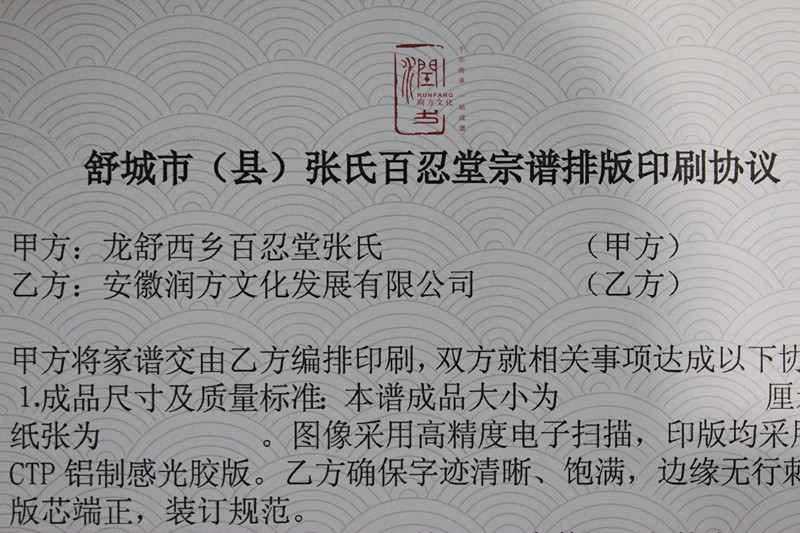 龍舒西鄉(xiāng)“百忍堂”《張氏宗譜》與我公司簽訂排版印刷協(xié)議