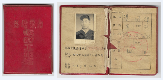 整理他的遺物,發(fā)現(xiàn)了這張《外地勞力臨時工作證》:1972年10月1日,銅陵市革委會民政勞動局簽發(fā)。我把它簡稱“勞工證”。內(nèi)附一張證件照,這是我見過的父親唯一一張青壯年時期的照片:臉龐清瘦,身形壯實(shí)。憂郁而略帶疲憊的眼神注視著我,一如桌前他遺像那樣。