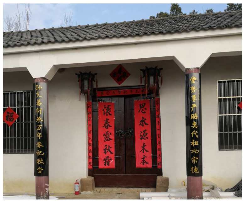有了資金,于二○○八年動工復建,二○一○年告竣。這次復建按原貌在原地落成,座北向南,占地面積約三千多平米,建筑面積二百多平米,建筑為磚木結構,外觀以高墻封護式,白墻青瓦,錯落有致,中正典雅,莊重大方,觀感更古色古香。整體有門前廣場,門廳天井,祀廳,廂房組成。