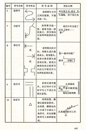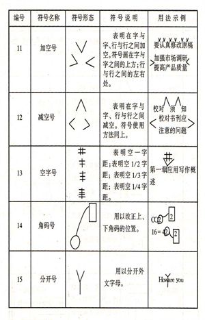 1981年12月,我國發(fā)布了中華人民共和國專業(yè)校準GBI-81《校對符號及共用法》,該標準規(guī)定的符號共有22種,常用的有以下15種。
