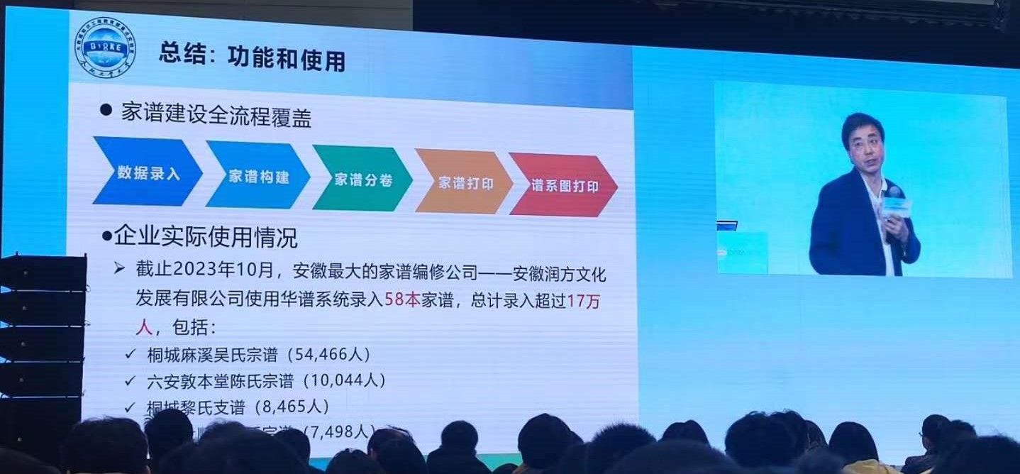 吳教授在報(bào)告中闡釋了華譜系統(tǒng)的開發(fā)基礎(chǔ)邏輯、開發(fā)過程及實(shí)踐應(yīng)用。該系統(tǒng)由安徽潤方文化發(fā)展有限公司與合肥工業(yè)大學(xué)大知識科學(xué)研究院共同開發(fā),是目前全國領(lǐng)先的數(shù)字家譜編修平臺,并率先由安徽潤方公司應(yīng)用于修譜實(shí)踐,目前通過安徽潤方公司已為超50支家族提供智慧修譜服務(wù),錄入人丁超17萬人。同時(shí),該系統(tǒng)還具有家譜續(xù)修、智慧宗祠、尋根問祖、在線祭祀、家族名錄、族事紀(jì)要等功能,未來將會服務(wù)更多的家族。