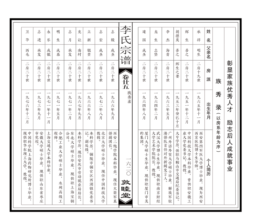 那么如何在家譜中描寫人物呢?我們認為,通過“人物贊”、“人物志”、“人物簡介”或“列表”(“芳名錄”、“族秀錄”等)的方式,以個人履歷、家風家教、社會公益事件記述等形式,力求準確反映人物的真實面貌,塑造真實可信的人物形象,使家譜具有充分的時代特色。