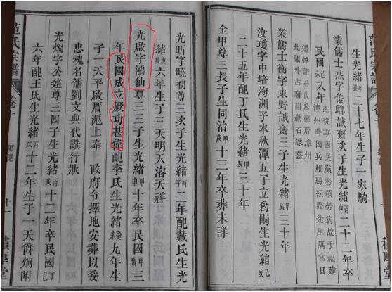 近代合肥四牌樓范氏家族之杰出人物當屬中華民國開國元勛,與宋教仁、陳其美并列為民國三烈士的范鴻仙了,在合肥四牌樓積厚堂范氏宗譜中對范鴻仙記載如下:“光啟字鴻仙尊三(范彥達)三子生光緒十年卒民國三年民國成立厥功甚偉”,他們家領(lǐng)譜人為其次兄光昕,領(lǐng)譜序號為16號。