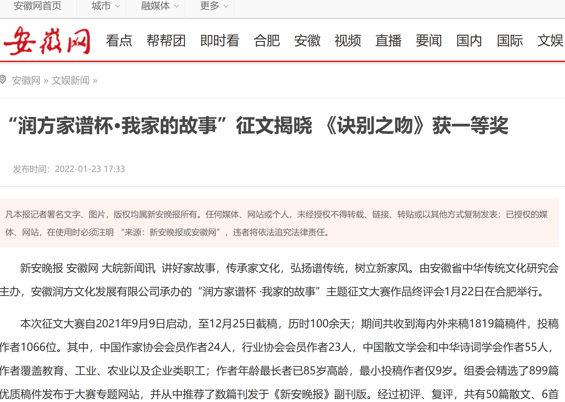 本次征文大賽自2021年9月9日啟動,至12月25日截稿,歷時100余天;期間共收到海內(nèi)外來稿1819篇稿件,投稿作者1066位。其中,中國作家協(xié)會會員作者24人,行業(yè)協(xié)會會員作者23人,中國散文學(xué)會和中華詩詞學(xué)會作者55人,作者覆蓋教育、工業(yè)、農(nóng)業(yè)以及企業(yè)類職工;作者年齡最長者已85歲高齡,最小投稿作者僅9歲。組委會精選了899篇優(yōu)質(zhì)稿件發(fā)布于大賽專題網(wǎng)站,并從中推薦了數(shù)篇刊發(fā)于《新安晚報》副刊版。經(jīng)過初評、復(fù)評,共有50篇散文、6首詩詞曲賦類作品進入終評環(huán)節(jié)。 在1月22日下午的終評會上,為保證征文的公正性,權(quán)威性,組委會邀請了省文史館、省社科院的多位學(xué)者以及省內(nèi)文藝評論界的“大咖”到場。評委們審慎對待每一篇入圍作品,并分別就作品作出精彩點評,最終評選出一等獎1名,二等獎3名,三等獎5名,優(yōu)秀獎10名,入圍獎20名。
