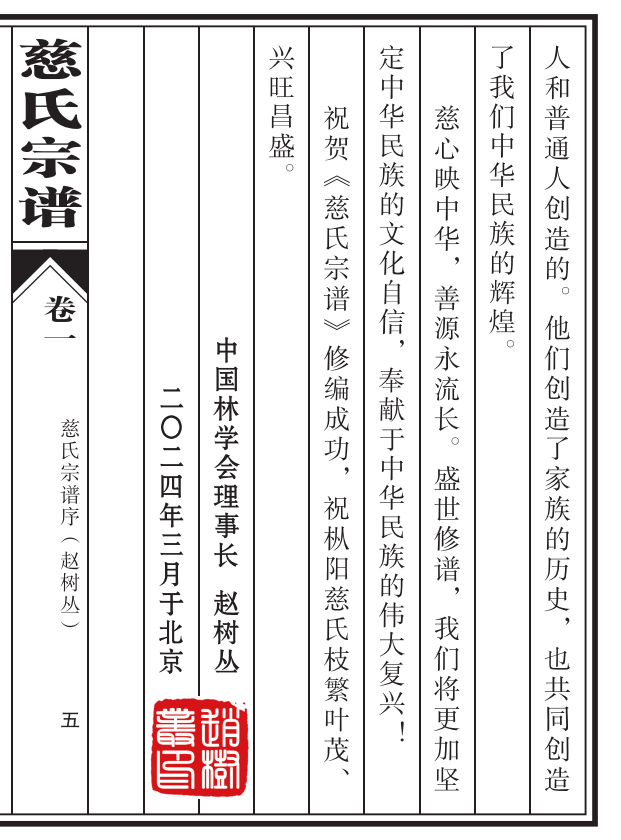 中國林學(xué)會理事長,原國家林業(yè)局局長,安徽省委原常委、副省長,安慶市委原書記趙樹叢先生也為本次活動發(fā)來賀信,慈愛民總編親自宣讀。趙理事長在賀信中提到,姓氏文化是中華民族優(yōu)秀傳統(tǒng)文化的一大特色,修譜是中華民族賡續(xù)、初心向往未來的偉大傳承,希望樅陽慈氏家族能夠為國家、民族、社會、家族、家庭做出更大的貢獻,全文如下: