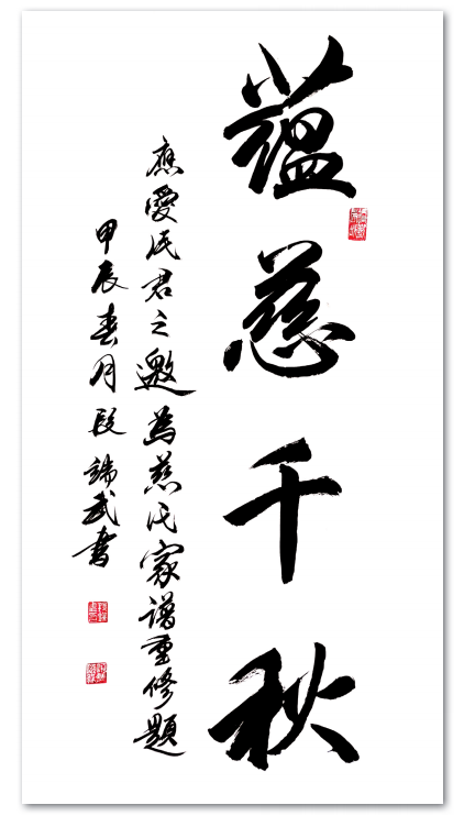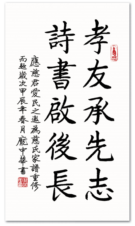 中國人民解放軍高級將領(lǐng)、將軍書法家段端武為新譜賀書“蘊慈千秋”,當(dāng)代著名硬筆書法家、教育家、詩人龐中華為新譜賀書“孝友承先志,詩書啟后長”。