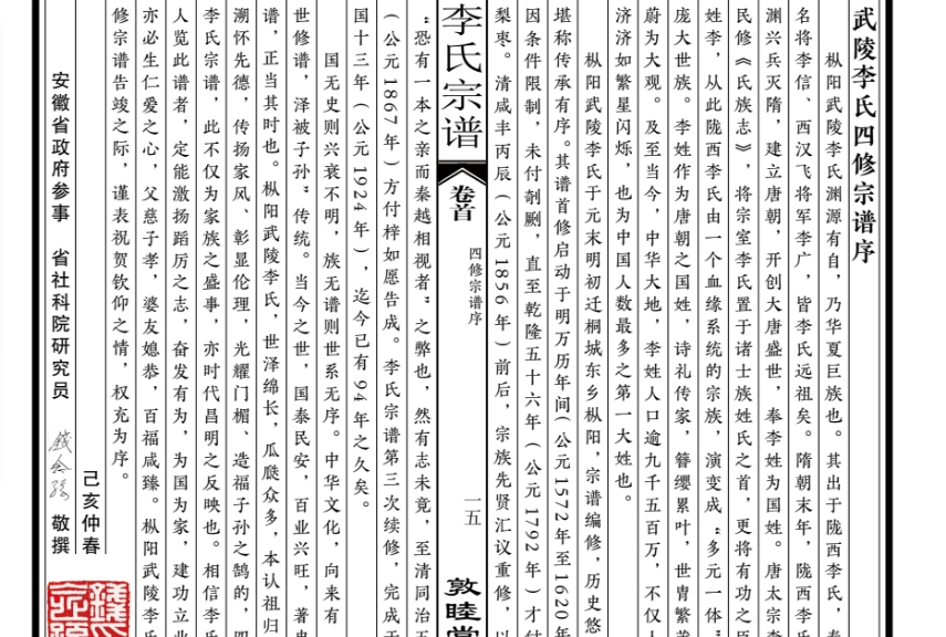 “三校一讀一清樣”。由省古籍辦、黨史地方志專(zhuān)家、譜牒文化研究專(zhuān)家、省級(jí)文史資料研究專(zhuān)家等國(guó)內(nèi)名家大咖,面對(duì)面集中點(diǎn)校新修家譜樣刊。